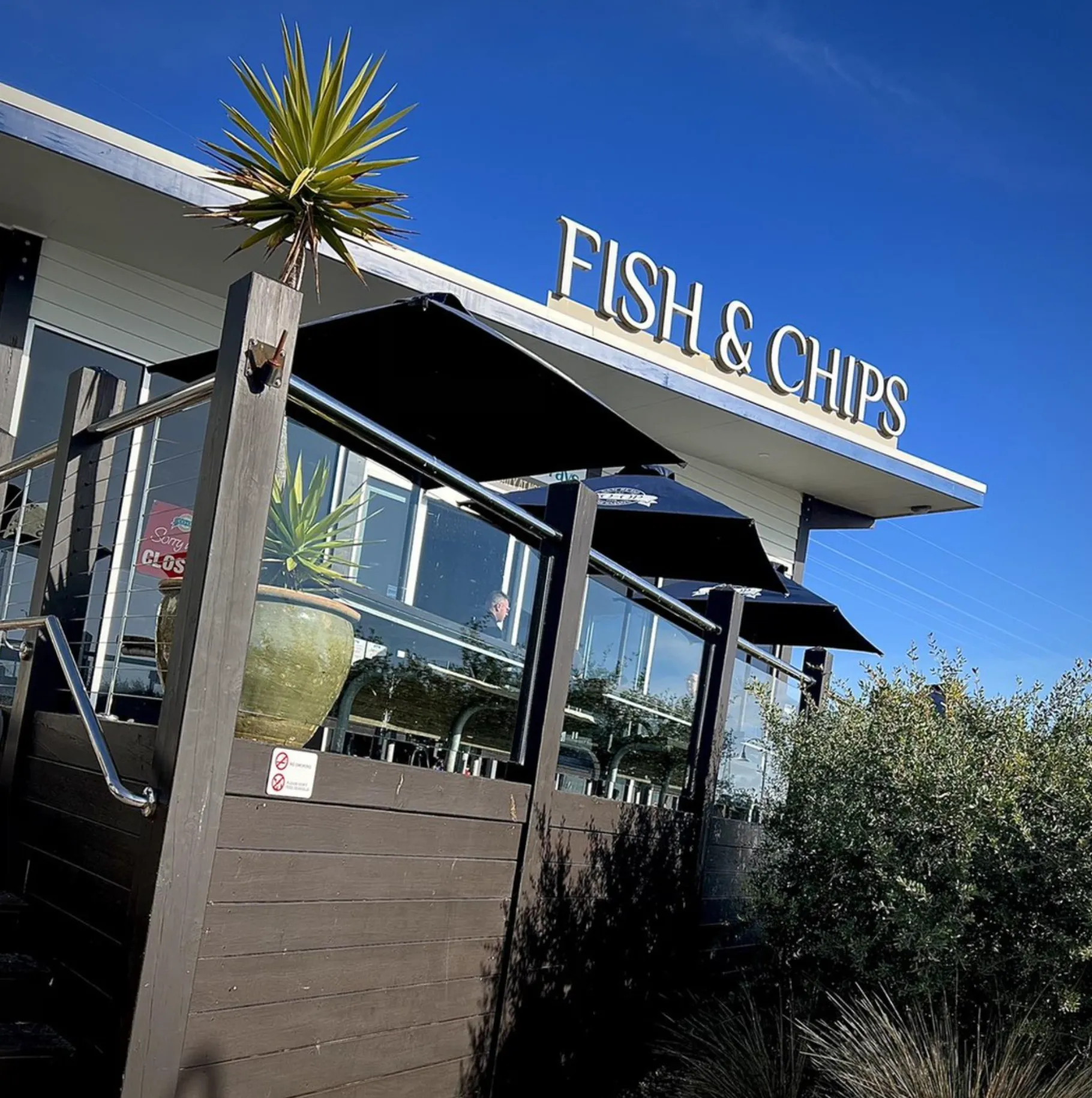 Yes, we have a dining area where you can enjoy fresh seafood, including the best fish and chips in town. Friendly staff and great views.