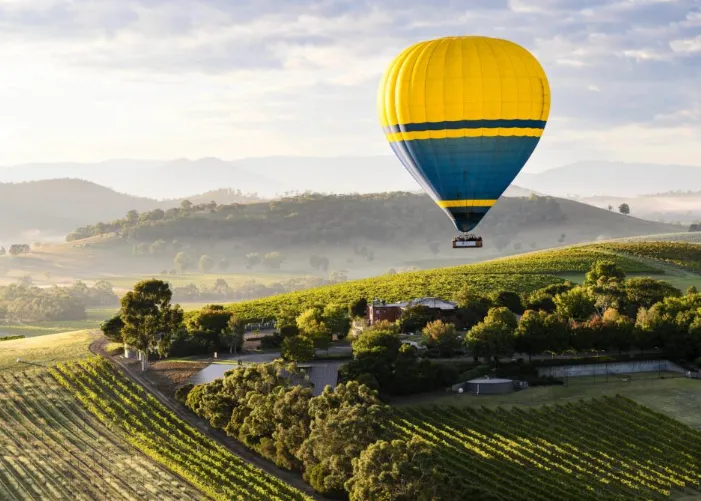 Hot air balloons can be seen flying over both the countryside and the city of Melbourne.